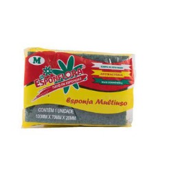 Esponja Multiuso: Serve para a limpeza comum das louças, como talheres, pratos e potes. Possui dupla ação, o lado da espuma (normalmente amarelo) pode ser usado para limpeza delicada, já a parte mais áspera (normalmente verde), chamada também de fibra abrasiva, é ótima para a sujeira mais difícil.